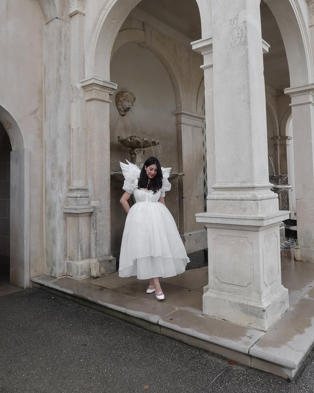 This one almost feels like a scene from a romantic period film. The airy white dress paired with delicate wing-like sleeves gives the entire look an ethereal softness, especially set against those grand stone arches and quiet fountains.