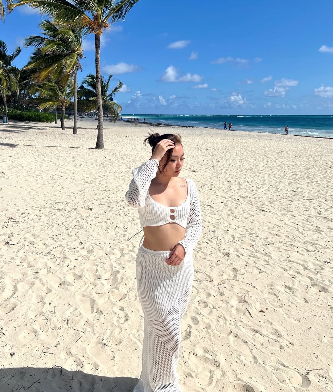 This crochet set brings that relaxed coastal style to life. The fitted knit skirt paired with the cropped cardigan gives the outfit a breezy feel that fits perfectly with the sandy shoreline and bright blue water.