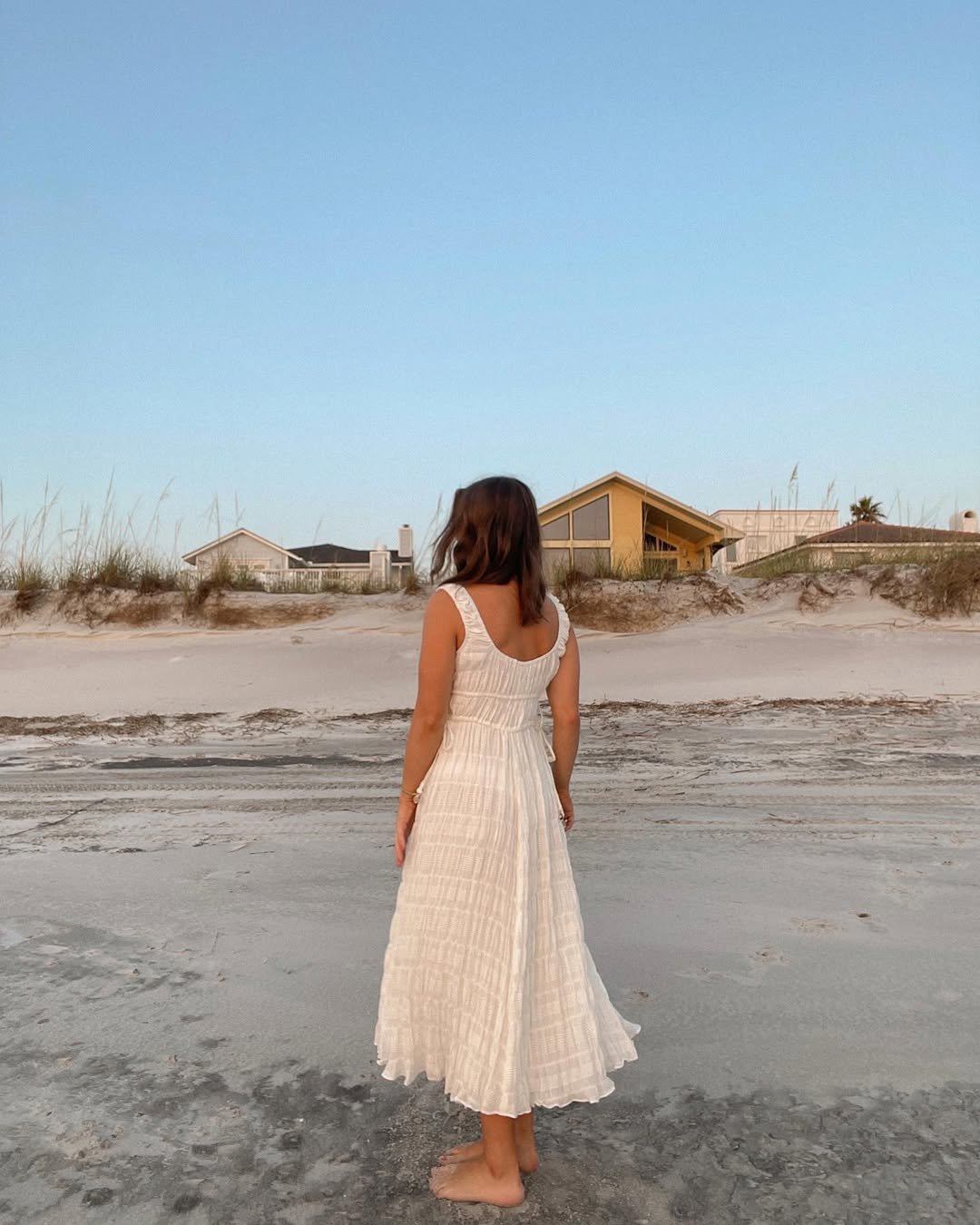The relaxed silhouette gives the look a dreamy feel, almost like something you’d wear on a slow beach vacation where time doesn’t really matter. Add delicate jewelry and a woven tote, and the whole outfit feels effortlessly romantic.