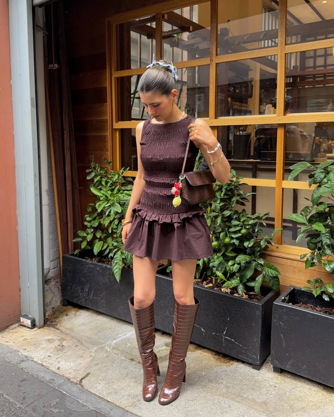 There’s a playful charm to this chocolate-toned mini dress. The textured bodice paired with the ruffled hem adds just enough movement to keep the look lively and fun.