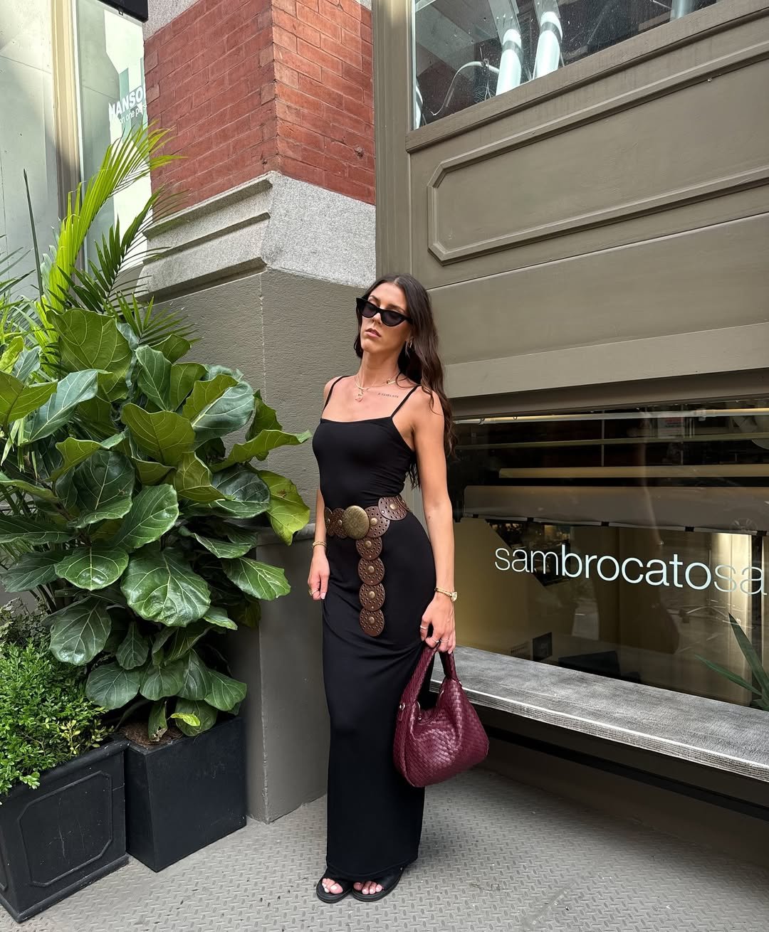 There’s something powerful about a sleek black dress done right. This one keeps the silhouette simple but lets that oversized statement belt do all the talking.