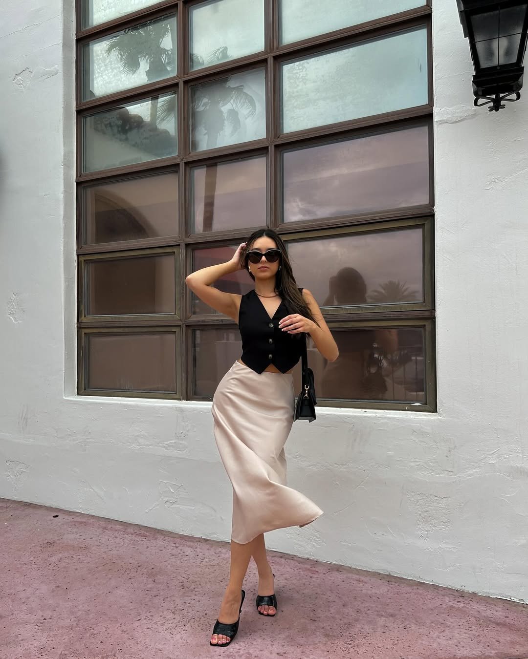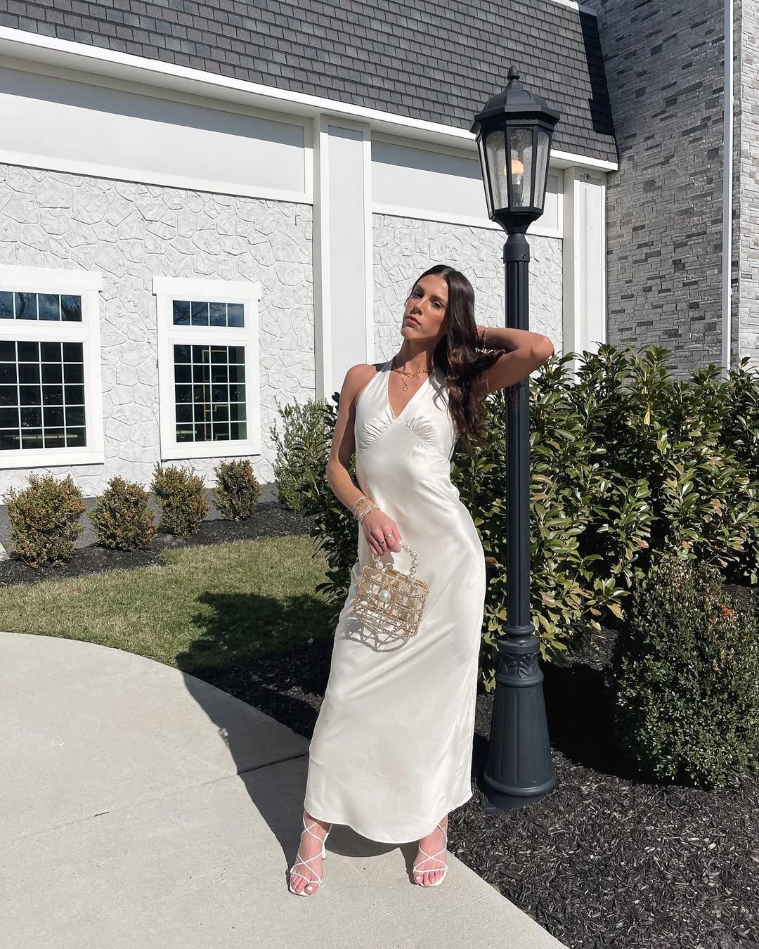 A satin slip dress like this always feels timeless. The soft ivory tone paired with delicate straps and strappy heels keeps everything light, elegant, and quietly polished.