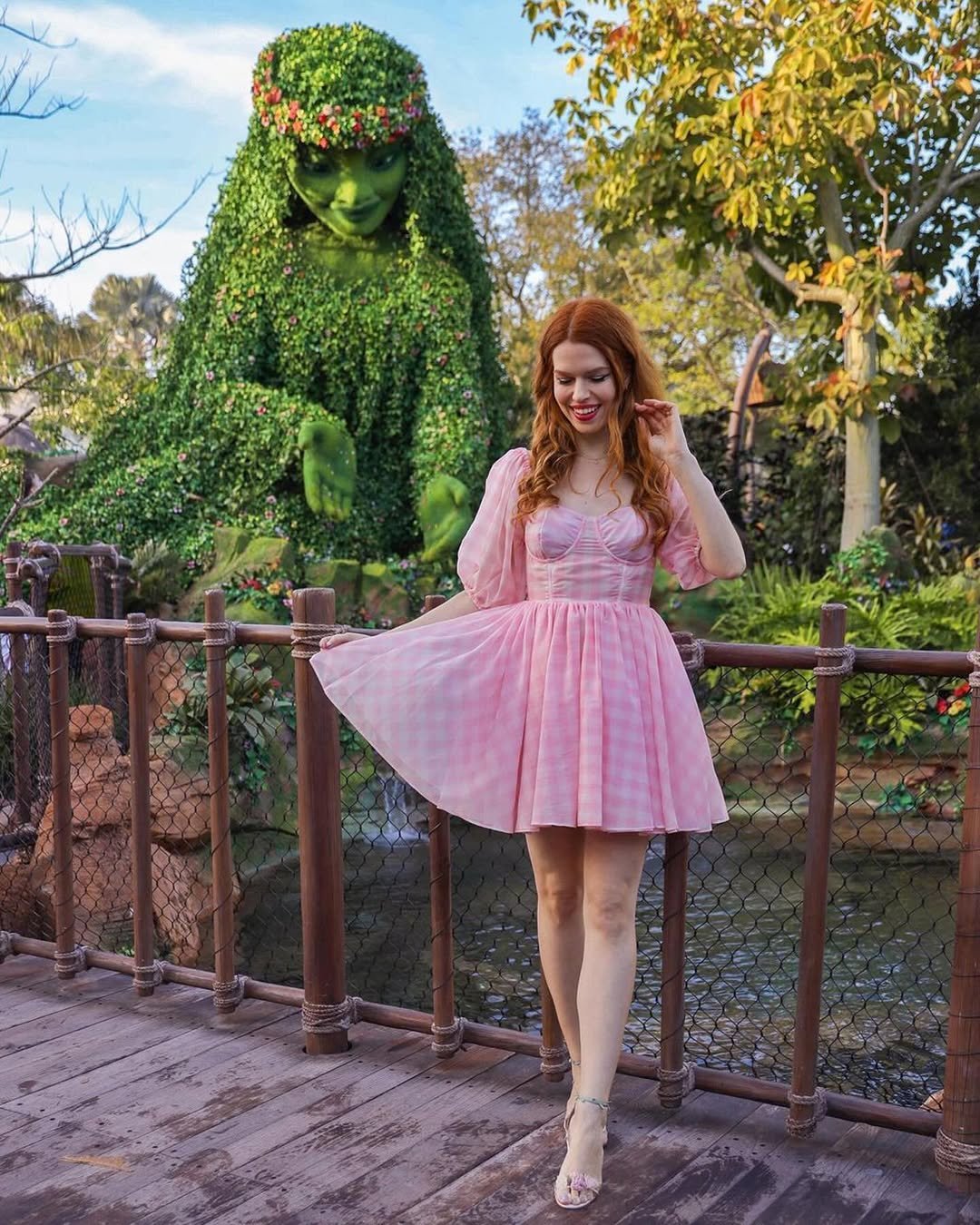 This look feels like stepping into a whimsical storybook garden. The soft pink gingham dress with puff sleeves and a corset-style bodice brings that playful, princess-like energy without feeling costume-like.
