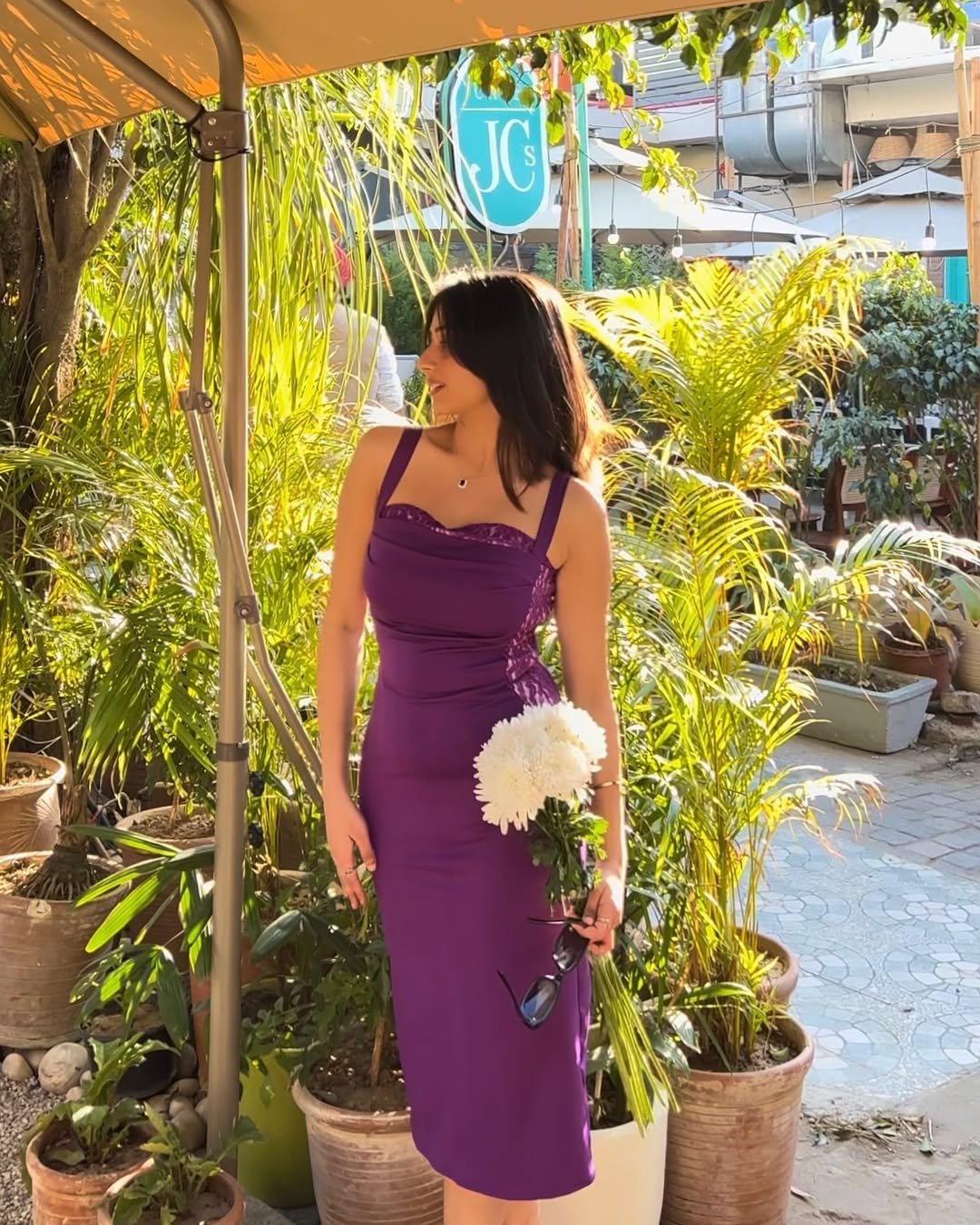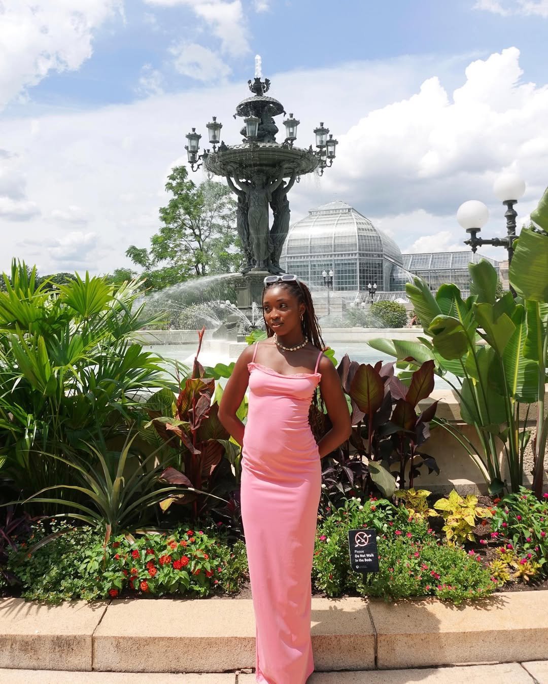 Standing in front of a grand fountain and glass conservatory, this sleek pink dress feels both elegant and quietly bold. The fitted silhouette lets the color take center stage, giving the whole outfit that confident, polished vibe.