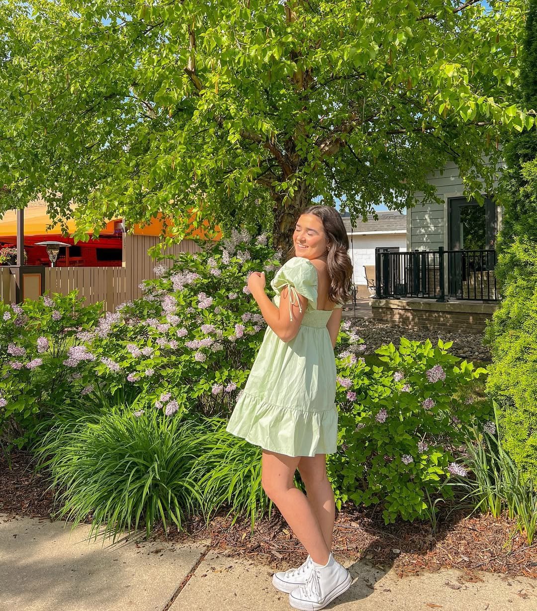 There’s something instantly cheerful about this look. The soft mint-green dress with puff sleeves feels like it belongs in the middle of a sunny afternoon garden, especially surrounded by blooming lilacs and leafy trees.