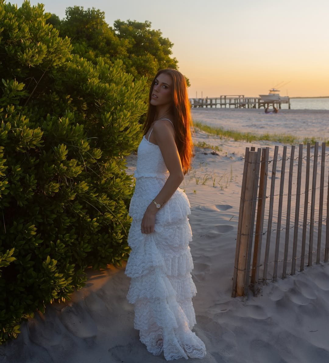 Sunset does half the styling here, and the dress does the rest. The layered lace skirt catches the warm golden light beautifully, giving the whole look that soft glow you only get during those last minutes before the sun dips away.