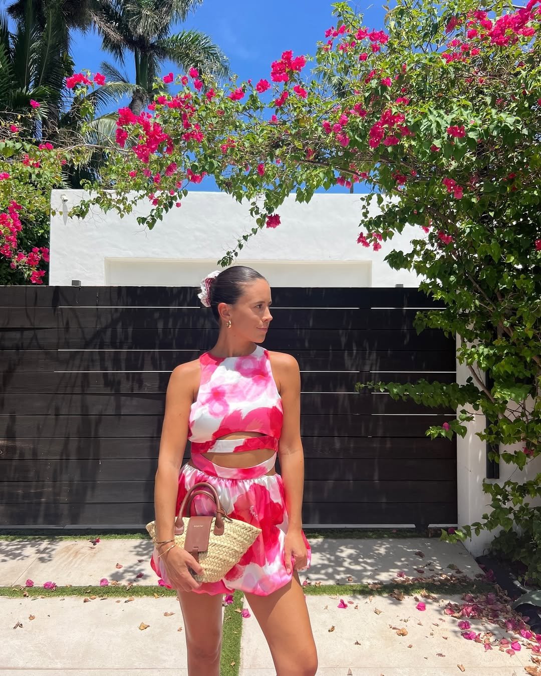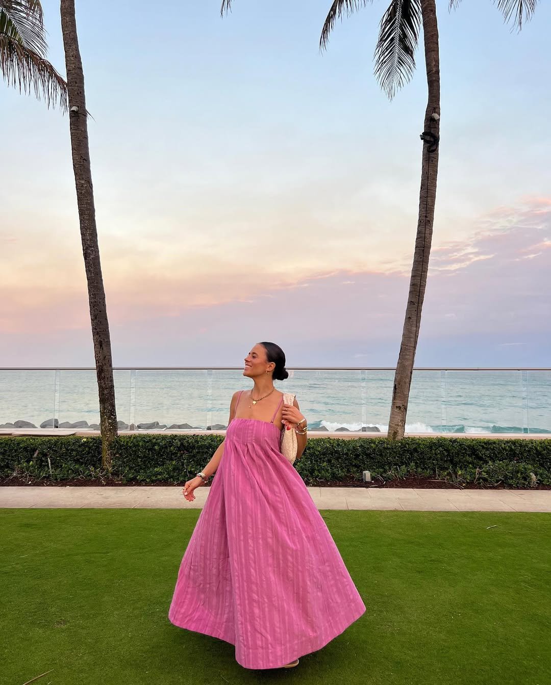 Framed by bougainvillea and palm trees, @allison.buch keeps the styling simple with a woven handbag and sleek bun. The result feels polished but easy, perfect for warm days that end with sunset dinners by the water.