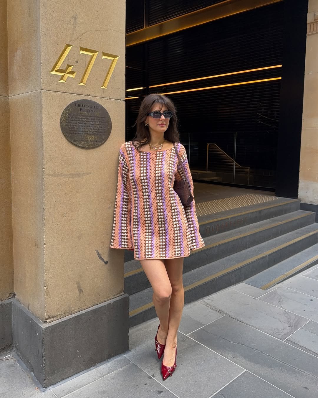 This crochet mini feels like a playful nod to vintage style. The striped pattern in warm tones gives it a nostalgic charm, while the slightly flared sleeves keep the silhouette fun and relaxed.
