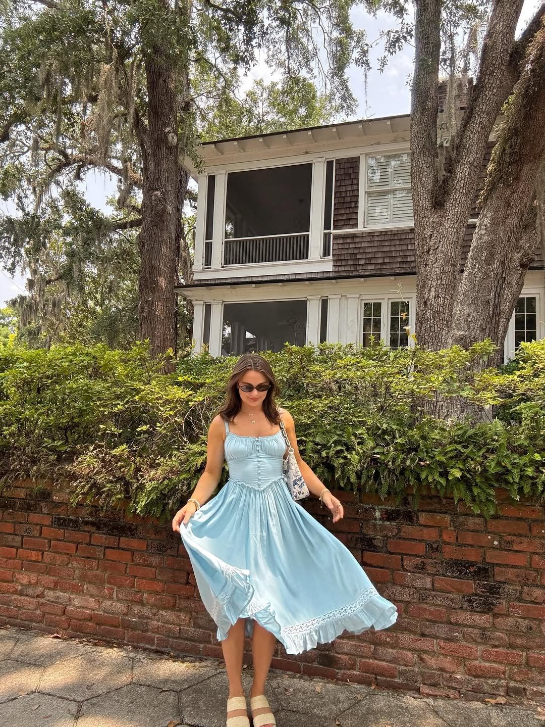 Set against brick walls and tall trees, the whole look has a quiet southern charm. It’s the kind of dress that feels perfect for warm afternoons wandering through peaceful neighborhoods.