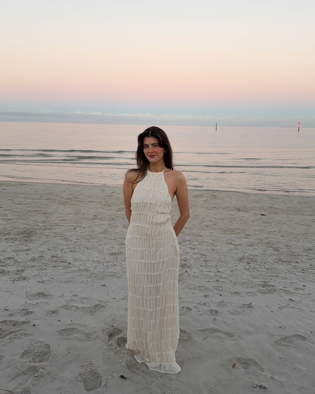 This dress feels made for quiet seaside evenings. The soft ivory fabric and delicate texture create a silhouette that feels romantic without being overly dramatic.