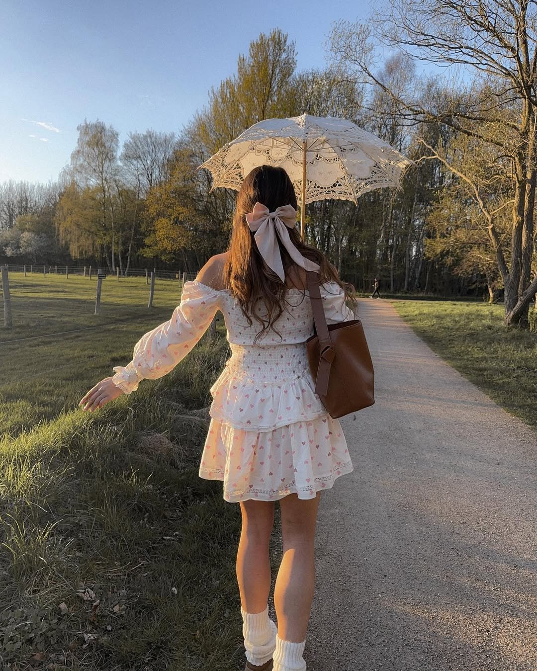 This look feels straight out of a countryside novel. The off-shoulder dress with tiny heart prints and puff sleeves has that charming cottagecore spirit, especially paired with the oversized bow and lace parasol.