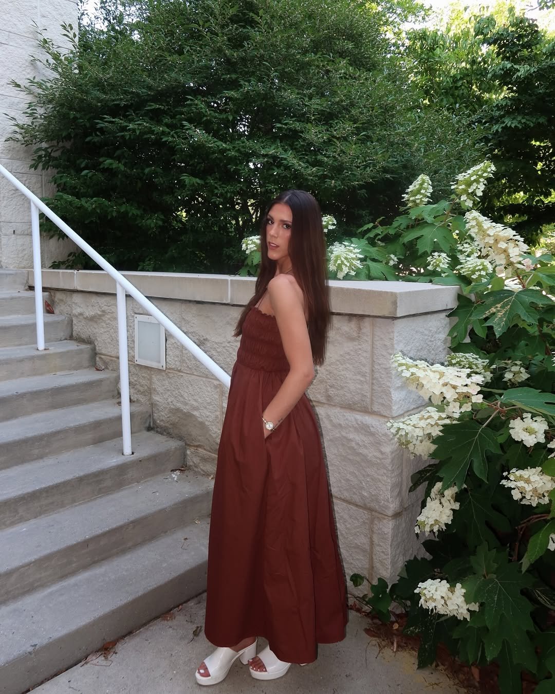 This rich terracotta dress feels like summer bottled into a color. The smocked bodice keeps the look effortless while the long flowing skirt brings just enough drama without trying too hard.