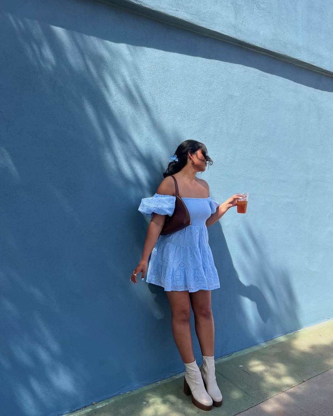 A baby blue eyelet babydoll against a matching blue wall? That’s commitment to a vibe. The off-shoulder detail keeps it flirty, while the loose tiered shape keeps it comfortable enough for an all-day coffee date.