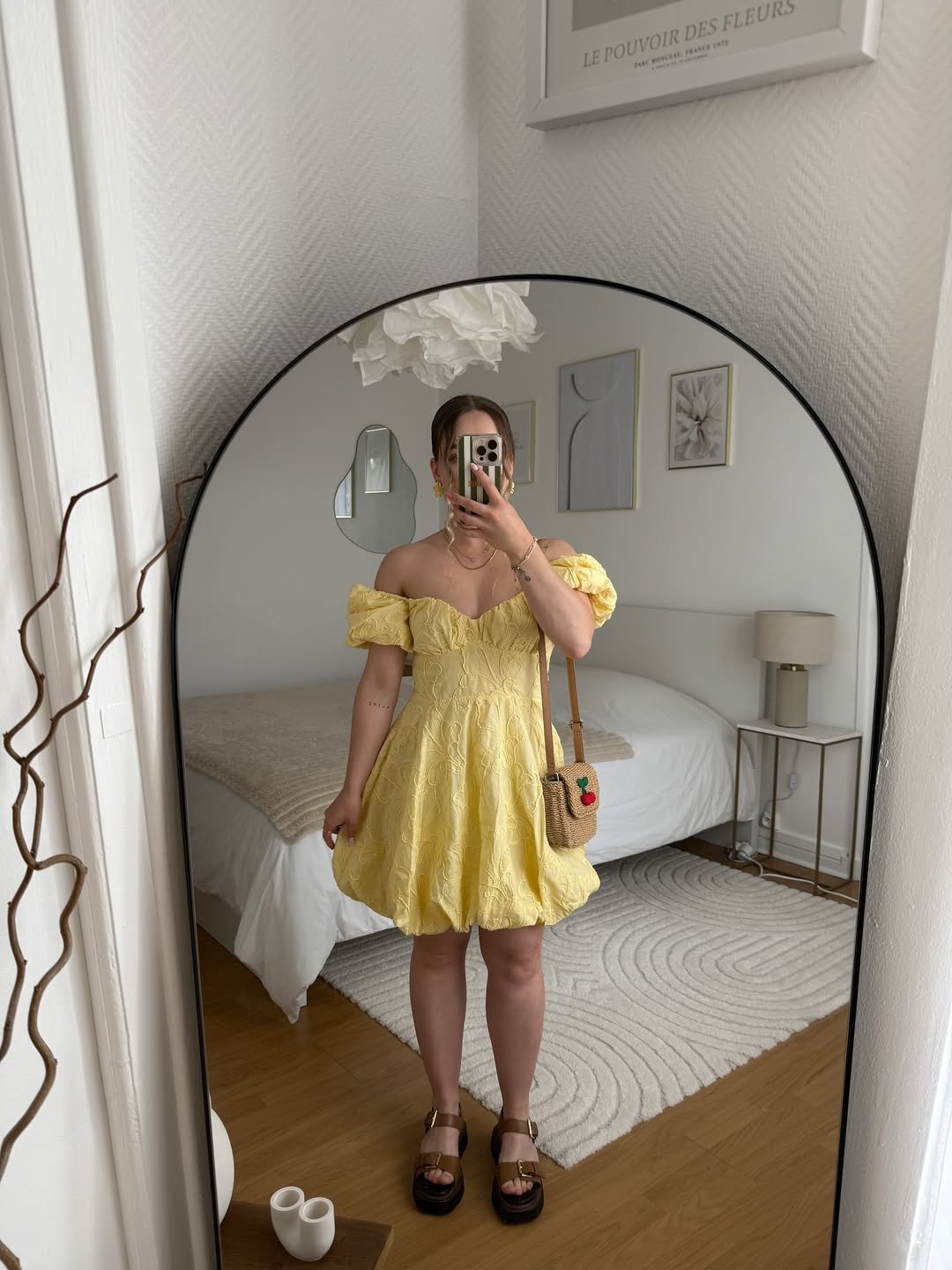 A butter yellow babydoll dress instantly softens the mood. @justinemt__ embraces puff sleeves and a rounded skirt that creates that doll-like shape, finished with chunky sandals and a woven mini bag.