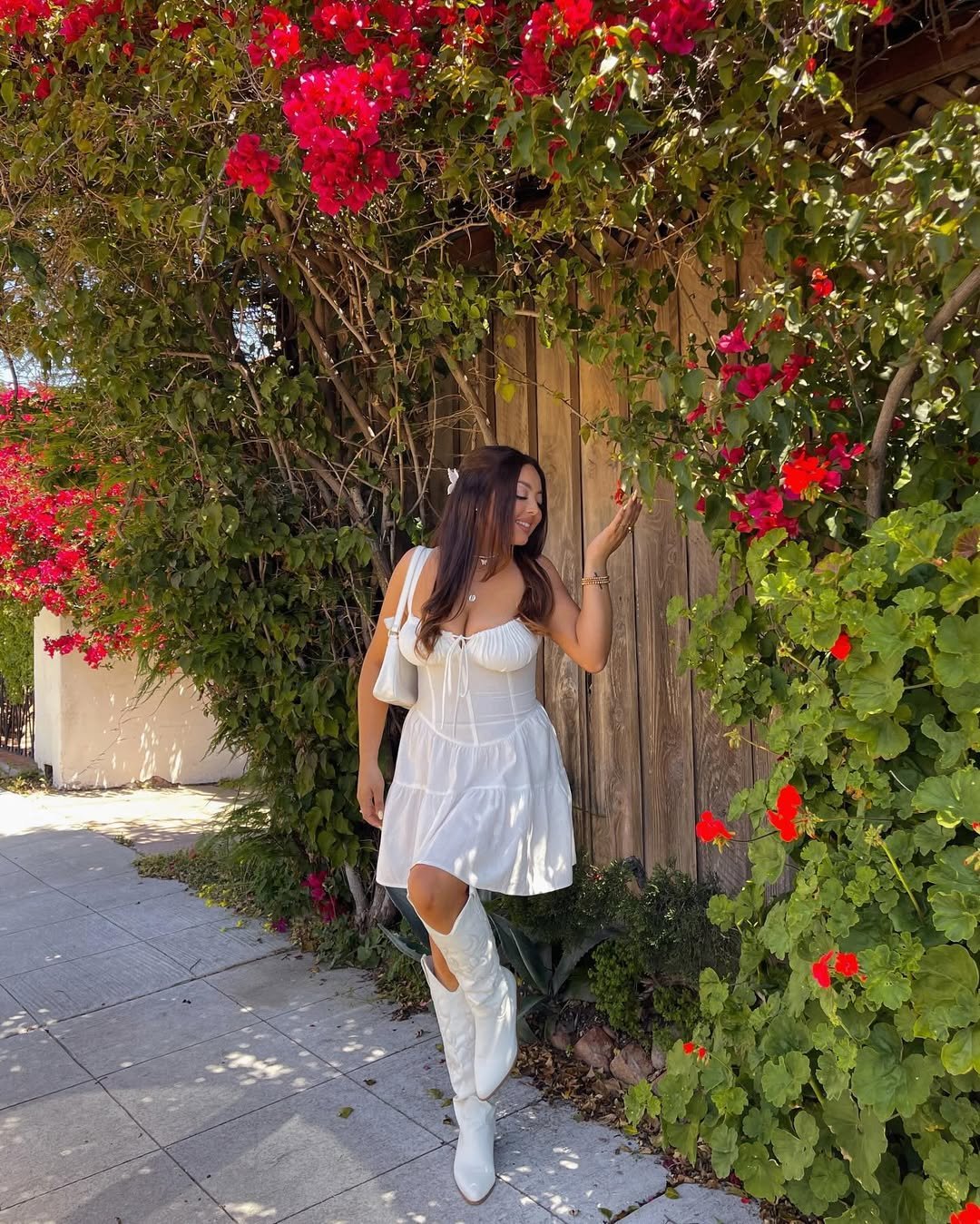 White, flouncy, and paired with tall boots, this look leans into cottagecore with a modern twist. @keepupkarina_ styles her babydoll dress with structured cowboy boots and a shoulder bag, balancing romance with edge.