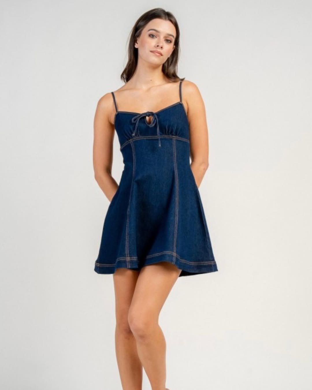 Babydoll meets denim in the cutest way. @jeansworldtt wears a structured denim mini with delicate straps and subtle seam details that shape the bodice before flowing into that signature flared skirt.