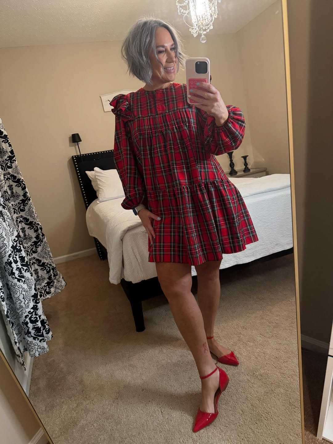 A red plaid babydoll with pointed heels? Yes, please. The structured neckline and ruffle details add interest without overwhelming the silhouette.