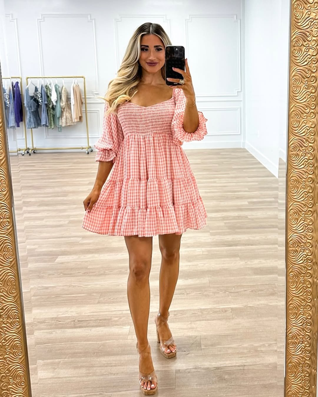 Smocked bodice, tiered skirt, pink gingham print—this one checks every babydoll box. It’s playful, flattering, and gives that boutique try-on energy we secretly love.