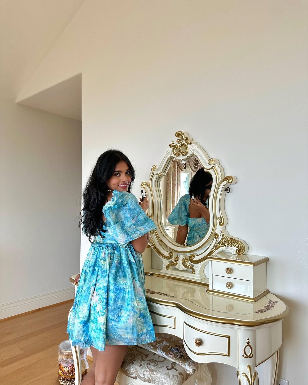 Standing next to that ornate vanity just amplifies the mood. It’s feminine, dreamy, and a little dramatic—in the best possible way.