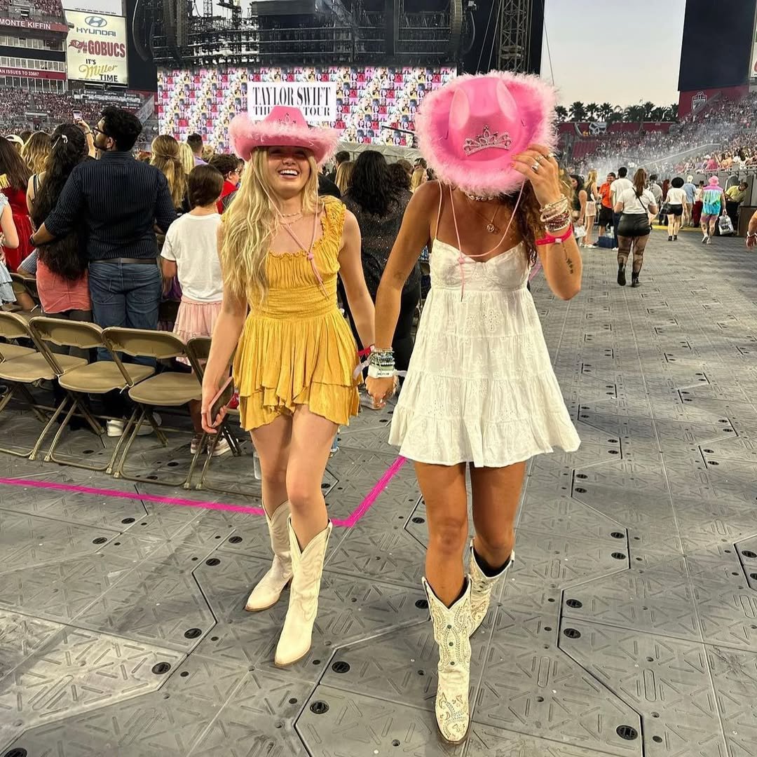 Nothing says main character moment like a babydoll dress at a concert. @boho_pink leans all the way in with a flouncy mustard mini, white cowboy boots, and a fluffy pink hat that feels straight out of a pop anthem. The tiered silhouette moves with every step, giving that carefree, dancing-in-the-aisle energy.