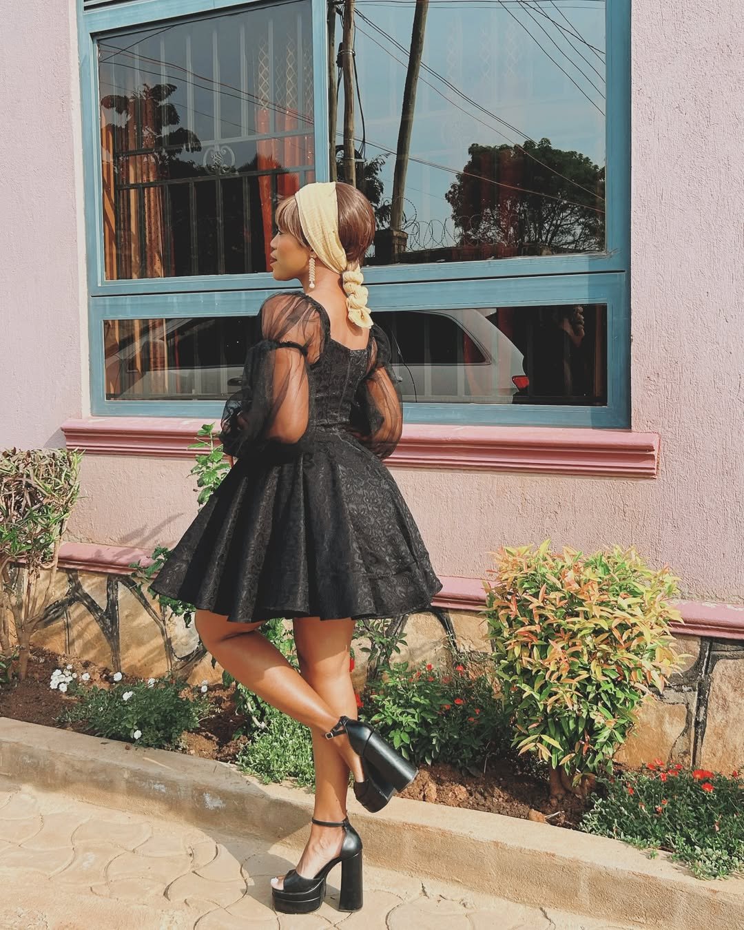 There’s something timeless about a black babydoll dress with sheer sleeves. @iamrachelk pairs delicate lace with a full skirt and platform heels, creating a look that feels vintage and modern at once. The headscarf adds a whisper of old Hollywood charm.