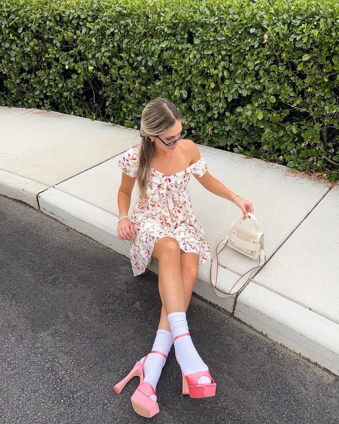 The off-shoulder neckline keeps it romantic, but the chunky heels and visible socks add that Gen-Z edge. It’s soft… but not shy.