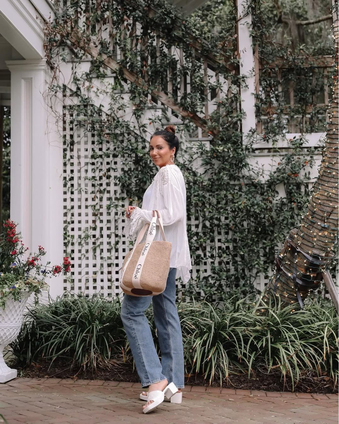 This one feels like stepping into a Nancy Meyers film—elegant, grounded, and slightly coastal. @anna_brstyle pairs soft, billowy lace with structured denim for a look that strikes the perfect balance between dreamy and practical. Her crisp white heels and woven designer tote keep things polished, while the undone waves and warm light suggest she’s just strolled out of a sun-dappled bookstore.