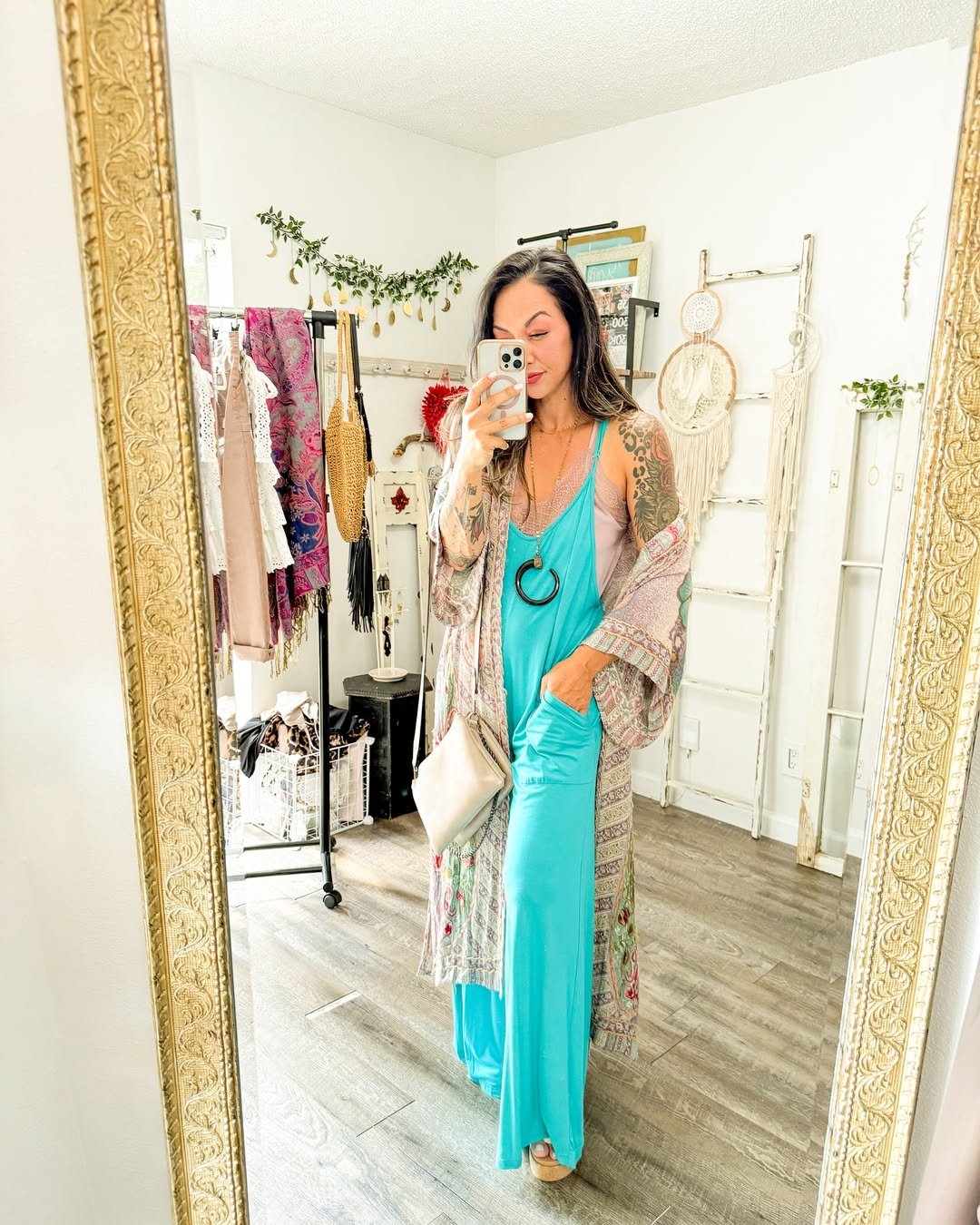 This mirror moment from @thehouseofgentry is pure boho magic. A sweeping turquoise maxi meets an intricate printed kimono, and the whole thing feels like it belongs somewhere between Joshua Tree and Tulum. The statement necklace and creamy clutch polish off the look with a gentle nod to free-spirited glamour.