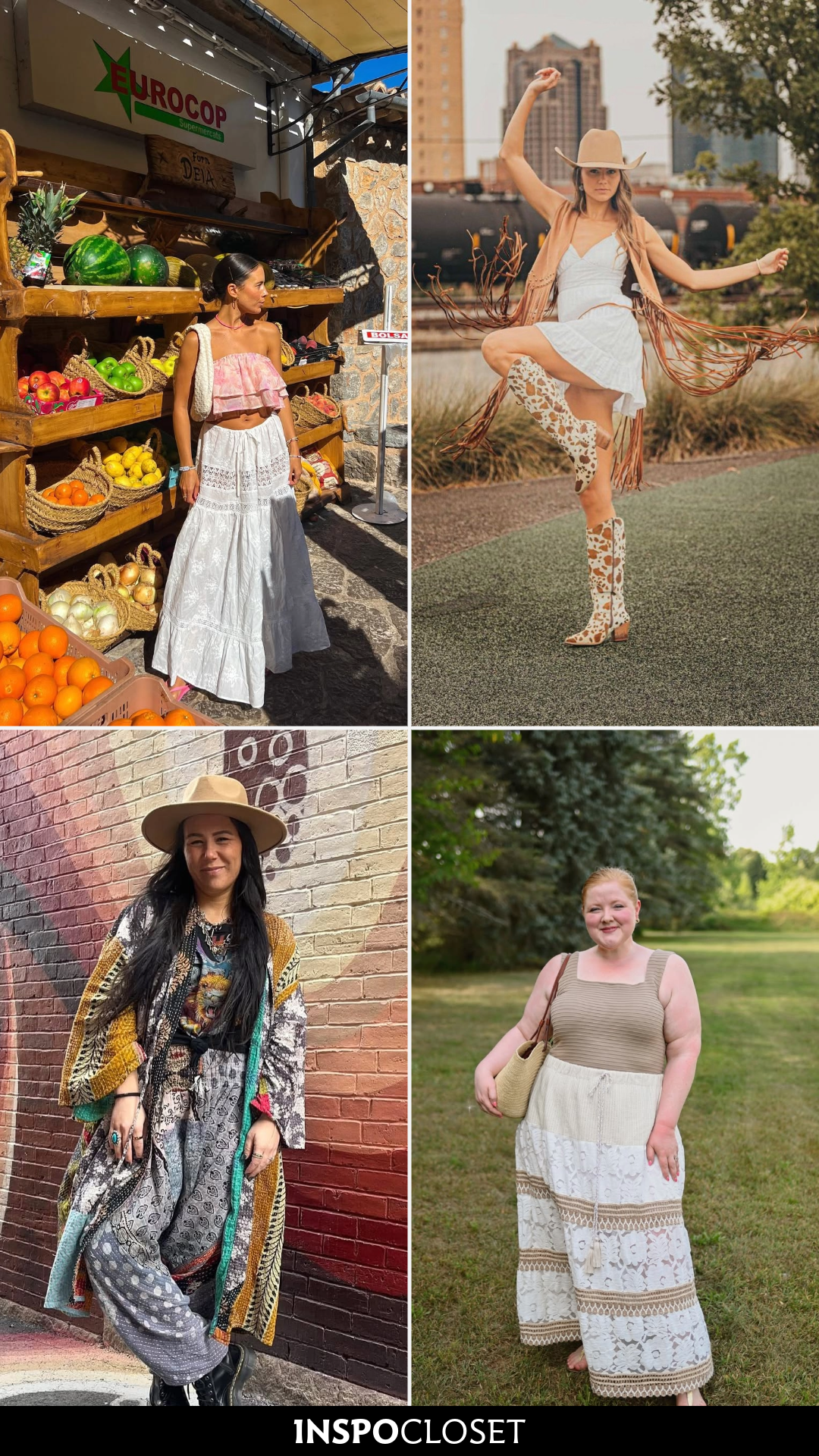 Now this is how you do Western-inspired without looking like you’re headed to a costume party. @dibatrue serves high fashion cowgirl with a crisp white mini dress, dramatic cow-print boots, and that scene-stealing wide-brim hat. The fringe vest? Chef’s kiss. It adds movement and flair, making this look feel editorial and bold—like something you’d wear to a desert art fair or an open-air concert in Santa Fe.
