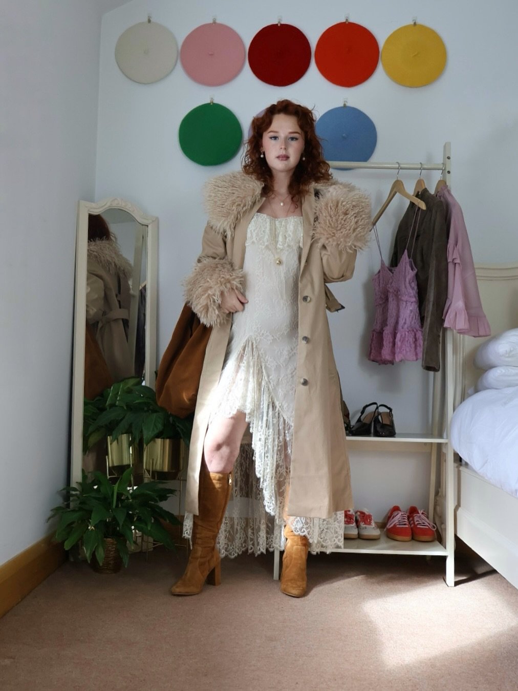 This look is like vintage romance stepped into a fall fairytale. @missniamhryan stuns in a dreamy ivory lace slip layered under a structured trench with the most deliciously dramatic faux fur trim. The textures play together beautifully—sheer, swishy lace peeking out from under weighty wool, grounded by rich suede boots that feel pulled from another time.