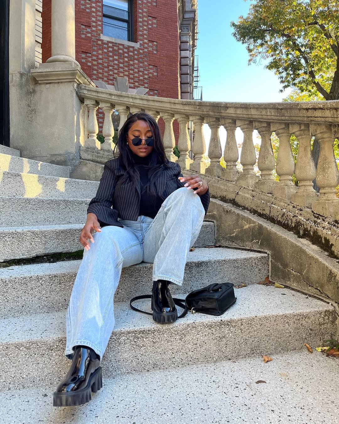 This is the kind of look that commands attention without raising its voice. The monochrome palette makes it feel elevated, while the shapes and accessories keep it playful and a little rebellious. It’s perfect for an artsy afternoon in the city or heading out to a fall music fest with boots kicking through leaves.