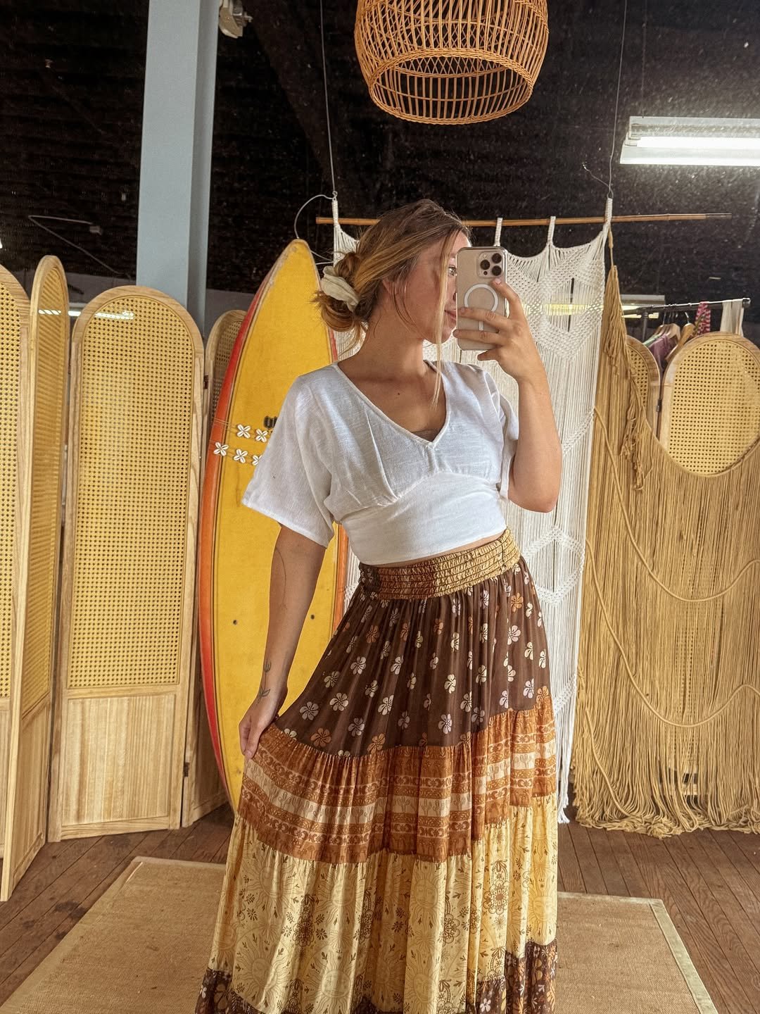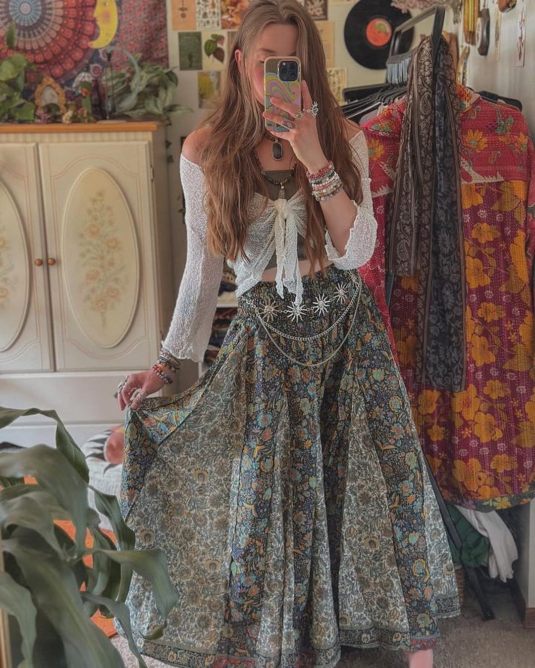 What really sets this apart is the simplicity. No heavy layering, no overdone accessories—just beautiful fabrics, movement, and a quiet confidence. It’s the kind of outfit you wear barefoot in a field or with worn leather sandals on a Sunday stroll. A little ethereal, a little boho, and completely mesmerizing.