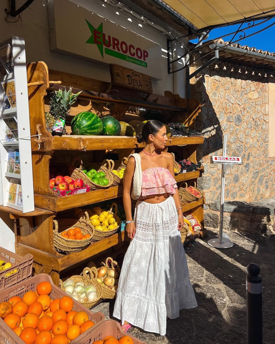 There’s something wildly charming about a fall outfit that still whispers of summer. @allison.buch masters the in-between with a delicate blush crop top and crisp white eyelet skirt, styled to perfection in front of a rustic fruit stand. The textures here do all the talking—airy cotton, sun-warmed skin, and a woven shoulder bag that looks like it’s been carried through Italian markets. It’s romantic, feminine, and effortless in that ‘just passed the olive grove’ kind of way.