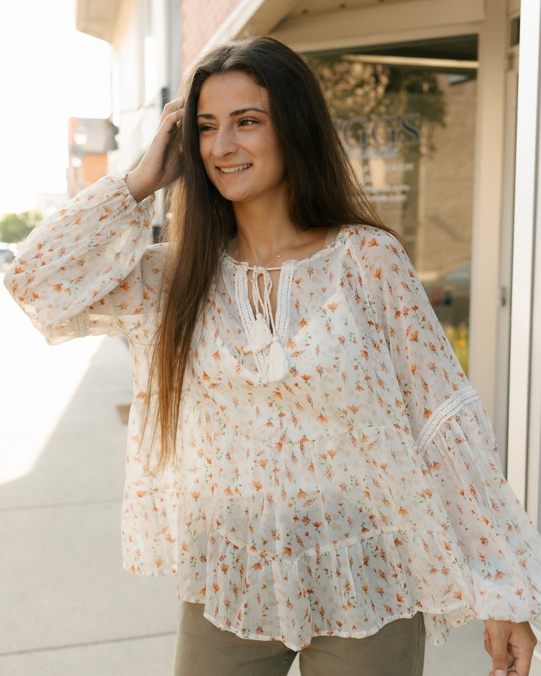 @redthreadboutique captures small-town sunshine in this sweet floral blouse that’s just made for golden hour. The blousy sleeves and tiered peplum hem give it that playful, feminine energy that flutters in the breeze, while the soft neutral trousers keep the whole look grounded.