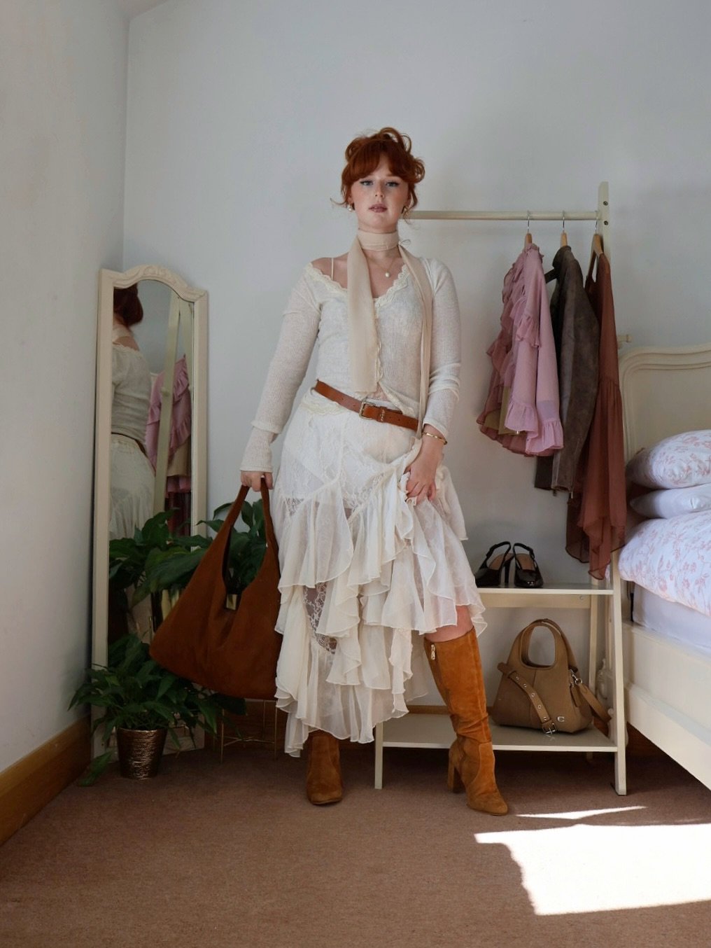 A true romantic, part two. @missniamhryan leans into her softest self with cascading ruffles, whisper-thin knits, and a belt that cinches the entire look into something almost Renaissance-inspired. The mix of lace, drape, and suede is so thoughtful—it doesn’t feel styled, it feels curated by feeling.