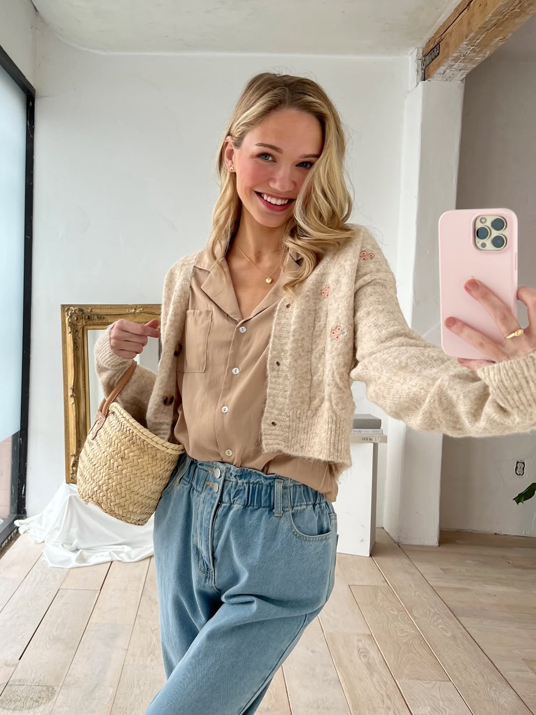 What makes this so good is the intentional layering—it’s not just “add a sweater.” It’s “add a sweater that tells a story.” The color choice flatters every skin tone, and the balance of softness and structure gives it that ideal “throw it on and go” vibe while still looking entirely put-together. It’s slow living in outfit form.