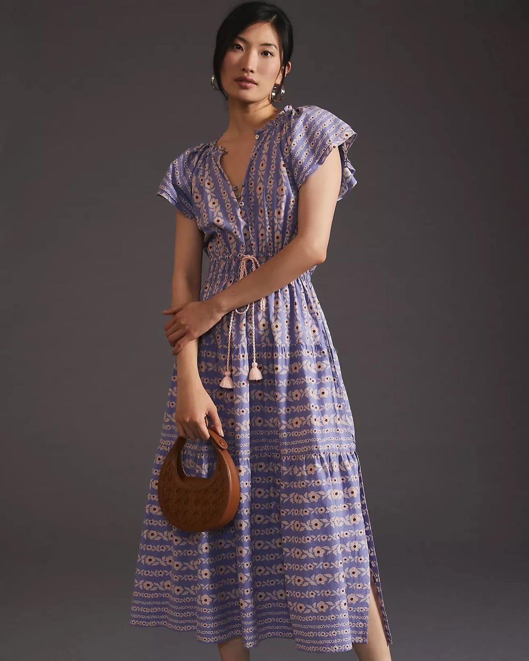 Lilac, gold buttons, and a twirl-worthy silhouette? Say less. The asymmetrical hem adds that little twist that keeps it from feeling predictable.