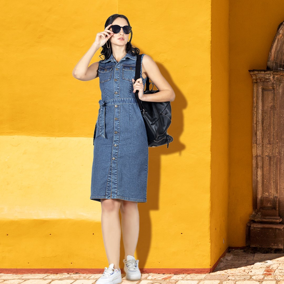 A sleeveless denim midi with front buttons and a waist tie? That’s casual gold. The structured shape gives it polish, while the sneakers keep things grounded and wearable.