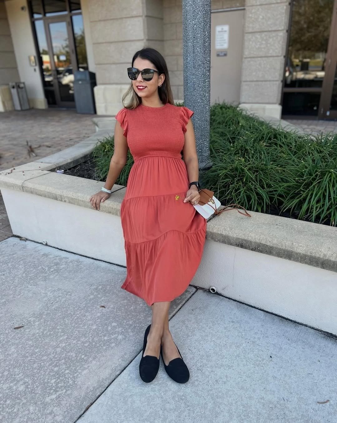 This rust-toned midi is what I call “throw on and glow.” The soft tiered skirt moves effortlessly, and those subtle ruffle sleeves add just enough charm without going full romantic. Paired with simple black flats and oversized sunnies, it feels polished but totally practical.