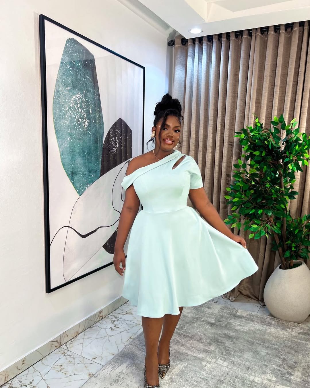 This soft mint midi brings modern elegance with that one-shoulder detail. It’s flirty, flowy, and full of personality without tipping into over-the-top territory.