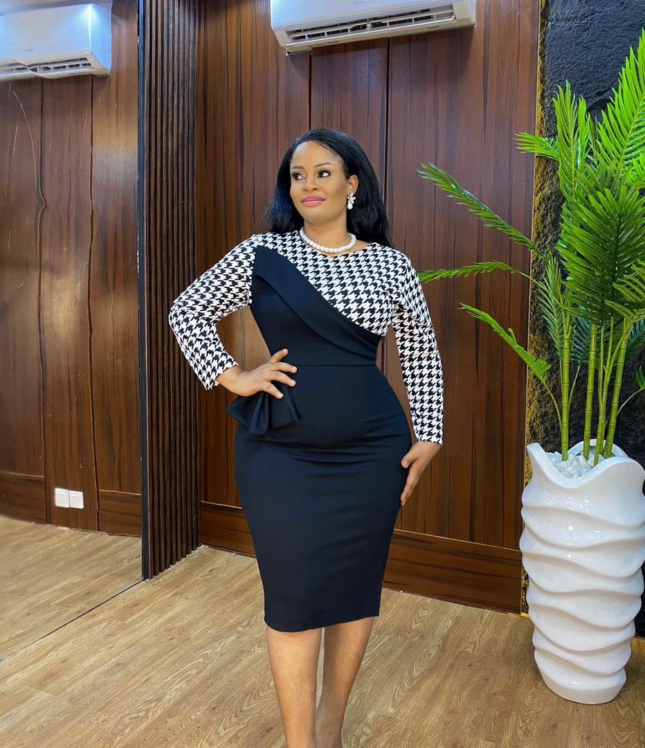 Black and white never disappoints, and this structured midi proves it. The patterned sleeves and asymmetrical detailing give it personality while the silhouette stays sleek and commanding.