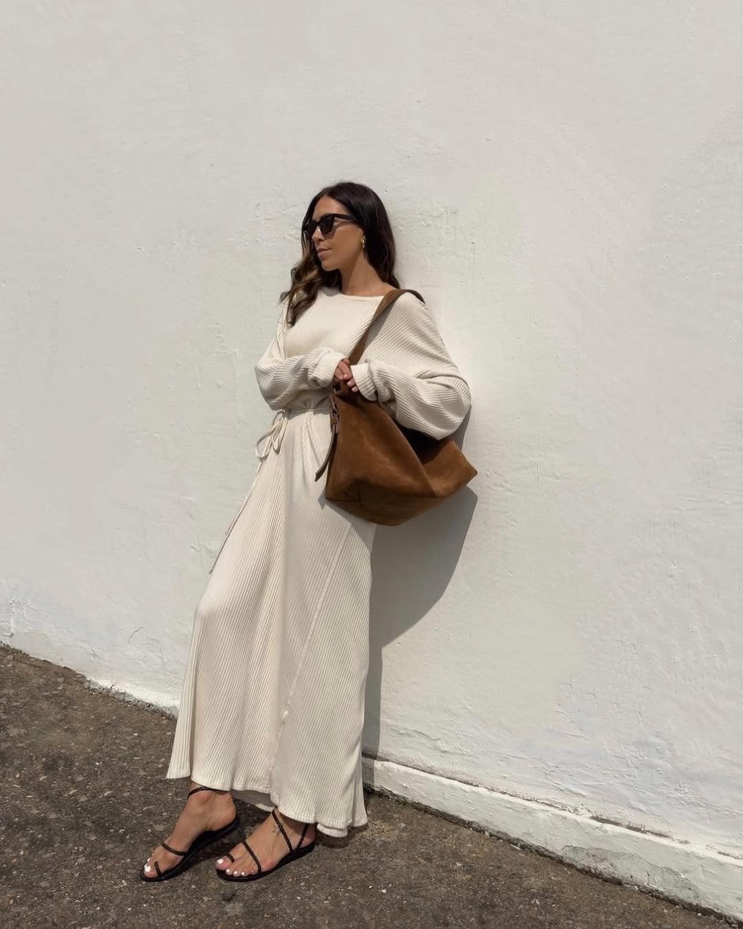 Styled with a slouchy brown tote and minimal sandals, it leans into earthy tones that always feel expensive. When neutrals are layered like this, the result is timeless and quietly striking.