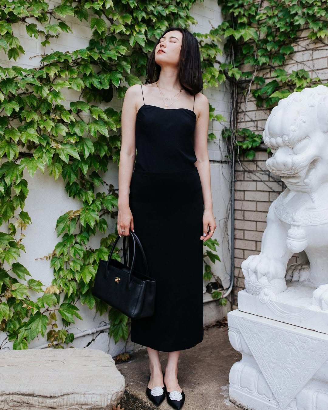 All-black but make it poetic. This strappy midi is clean, fluid, and effortlessly sharp—especially paired with those pointed flats and a structured handbag. It’s giving quiet luxury with a side of “I know exactly what I’m doing.”