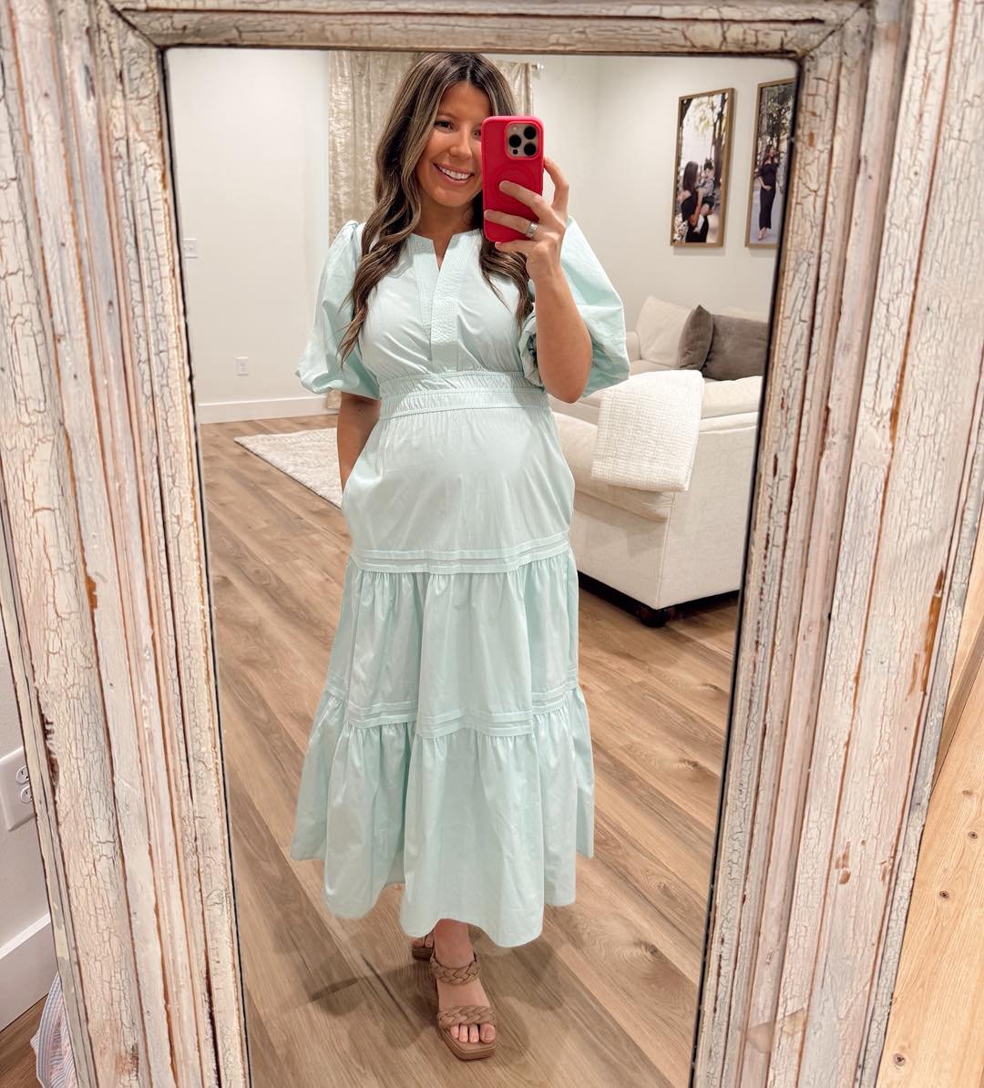 Floaty tiers, puff sleeves, and that airy mint shade, this one feels like a Sunday morning farmers market stroll. The cinched waist gives shape without sacrificing comfort, and the length keeps it grounded and versatile.