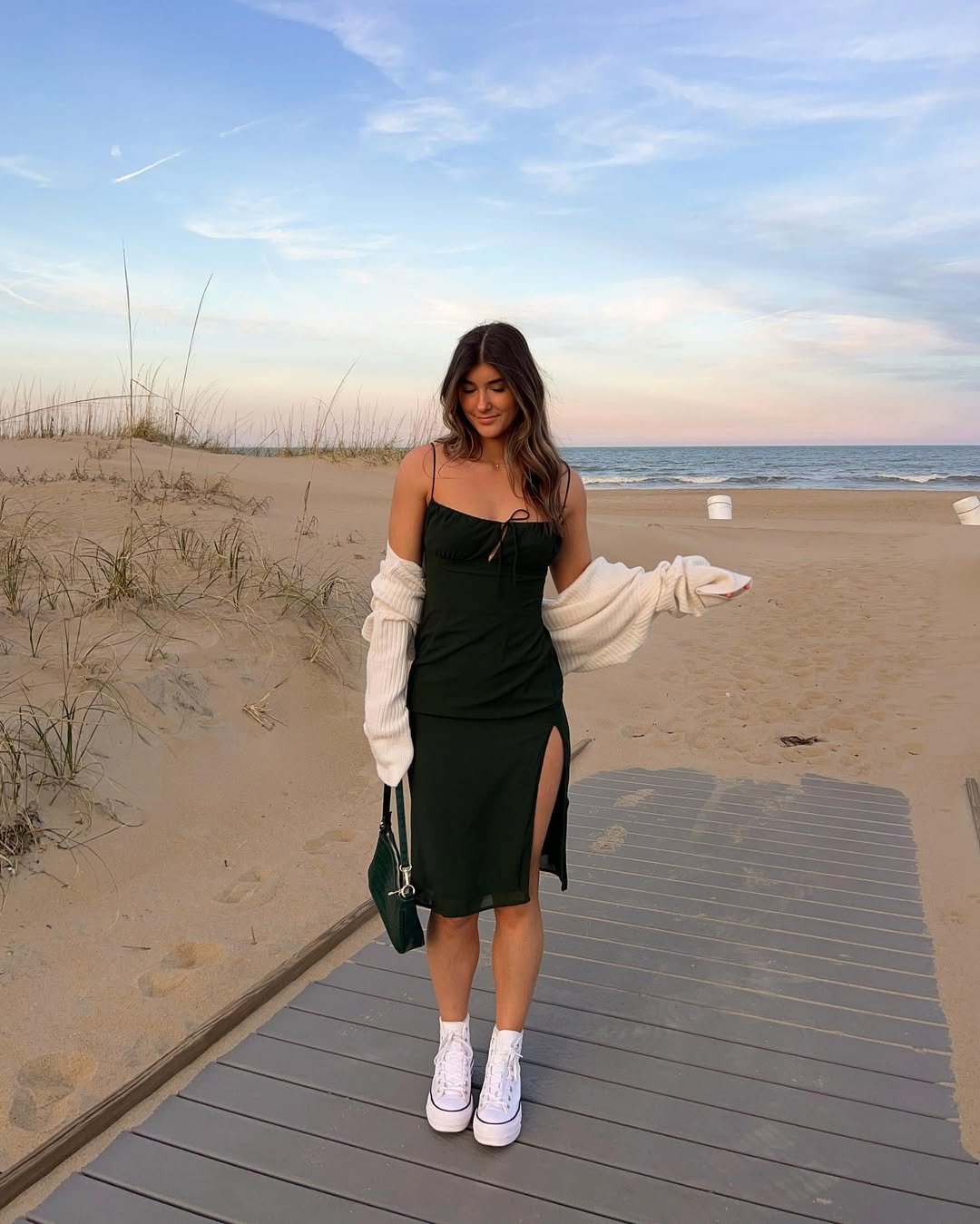 A sleek dark green midi on the beach at golden hour? Say less. The slim fit and side slit bring that subtle confidence, while the chunky white sneakers keep it grounded and wearable.