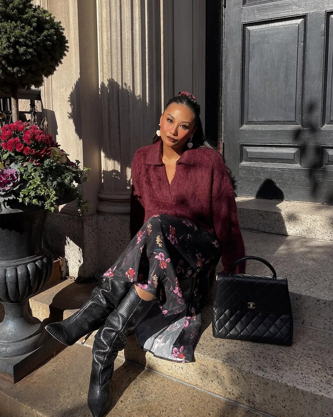 Velvety textures and fall florals? Now this is Thanksgiving glam done right. The deep burgundy sweater adds a romantic touch, while the flowy floral skirt brings movement and color. The structured bag and black statement boots pull it all together, creating a look that’s both sophisticated and seasonal.