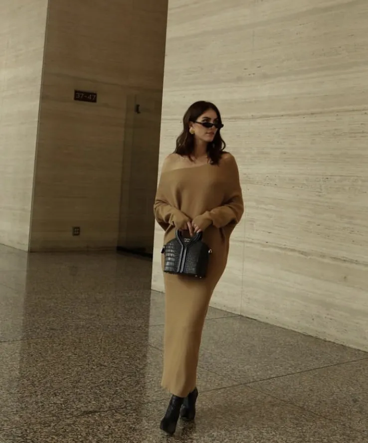 This is quiet luxury done right. A head-to-toe camel knit dress paired with sleek black ankle boots and a structured bag—simple, but every detail whispers sophistication. It’s that kind of outfit that moves effortlessly from brunch to dinner without missing a beat.