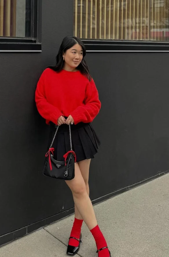 Red and black? Always a power combo. This playful outfit takes a bold crimson sweater and pairs it with a pleated mini skirt for a fun, youthful twist. It’s giving “holiday spirit, but make it fashion.”