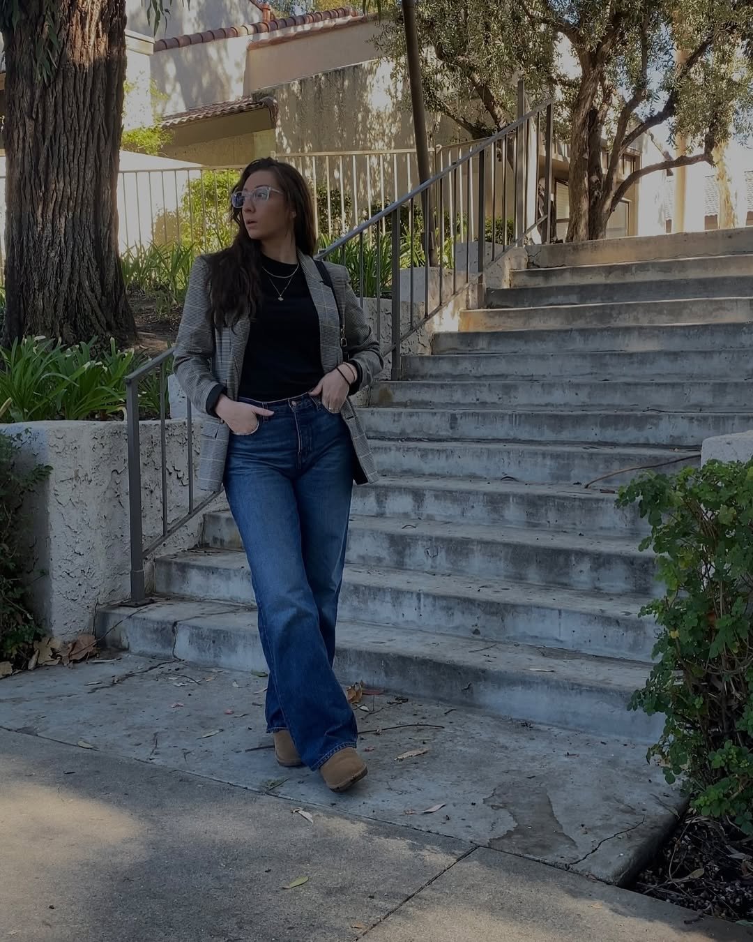 A timeless Thanksgiving combo—dark jeans, a black tee, and a checked blazer. It’s smart, practical, and endlessly wearable. The flared jeans and cozy boots add that touch of 70s flair while keeping it grounded.