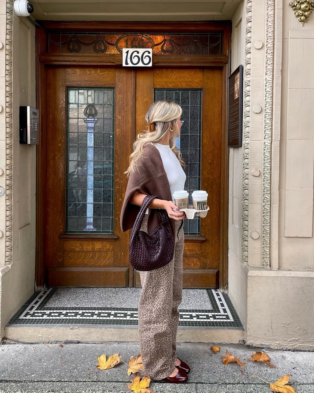 This one’s pure autumn charm. The leopard print pants steal the show, while the soft brown wrap adds warmth (and that perfect Thanksgiving coziness). Paired with burgundy flats and a woven bag, it’s equal parts playful and put-together.